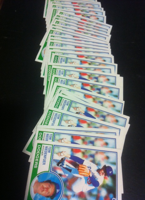 And looking at his life through a few websites, I surmise that he made his true match with Judy Landers. My imaginings carry a lot of weight in this matter and saying that he wised up by marrying a Hollywood starlet could be misguided. And yet, 27 years later Tom Niedenfuer and wife Judy Landers are still together. They are parents to Lindsey and Kristy, another set of famous Landers sisters. These Landers sisters are in the band Official Hot Mess, which seems to have gone dormant after releasing Fallin’ Angel (2007) and doing an apparent residency at the Playboy Mansion. I’m over-reaching here (and I’ve done it before–I thought Willie Nelson wrote Red-Headed Stranger in the misery of a divorce, then found out he and his wife hatched the song cycle road-tripping back to Austin after a ski vacation in Colorado) but maybe Tom Niedenfuer realized his first marriage was a mistake, and in meeting Judy Landers he changed his life, maybe he’s gone vegetarian like his daughters, maybe he does yoga, maybe he always did, what do I know? I hope he’s happy. (He is.) Just on the surface of his life he did things about which many people fantasize: being a big league pitcher and marrying an actress. And he retired before he was 32 years old. He never became a Hall of Fame pitcher, his rookie cards didn’t buy me a nice car, not even a six-pack of beer. I still have all 32 of those cards.